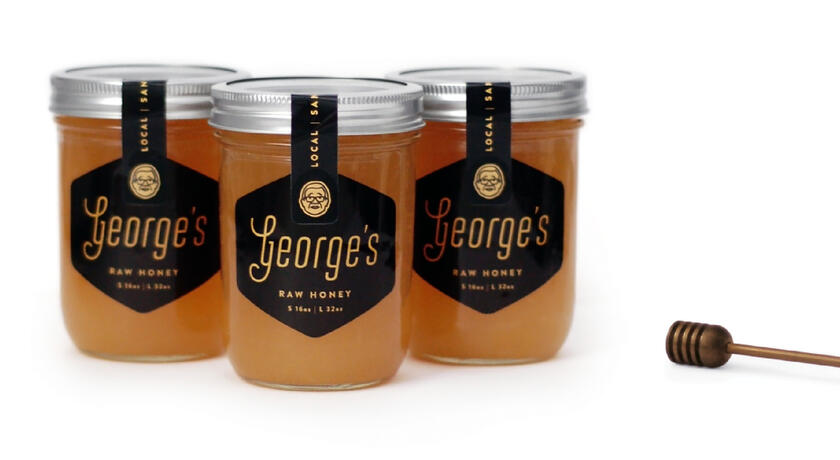 George Croitor, a passionate beekeeper, harvests and hand bottles raw honey. Instead of continuing to give away his product for free, George decided to sell the fruits of his labor. In keeping with the handmade theme, the honeycomb-shaped label drew elements from hand painted signage.